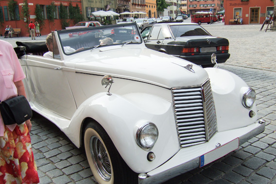 Ein Schnappschuss eines alten Cabriolets. Vorn öffnende Türen und ein aufliegendes Verdeck wie ein Käfercabrio geben Rückschlüsse auf die Entstehungszeit des Wagens.
